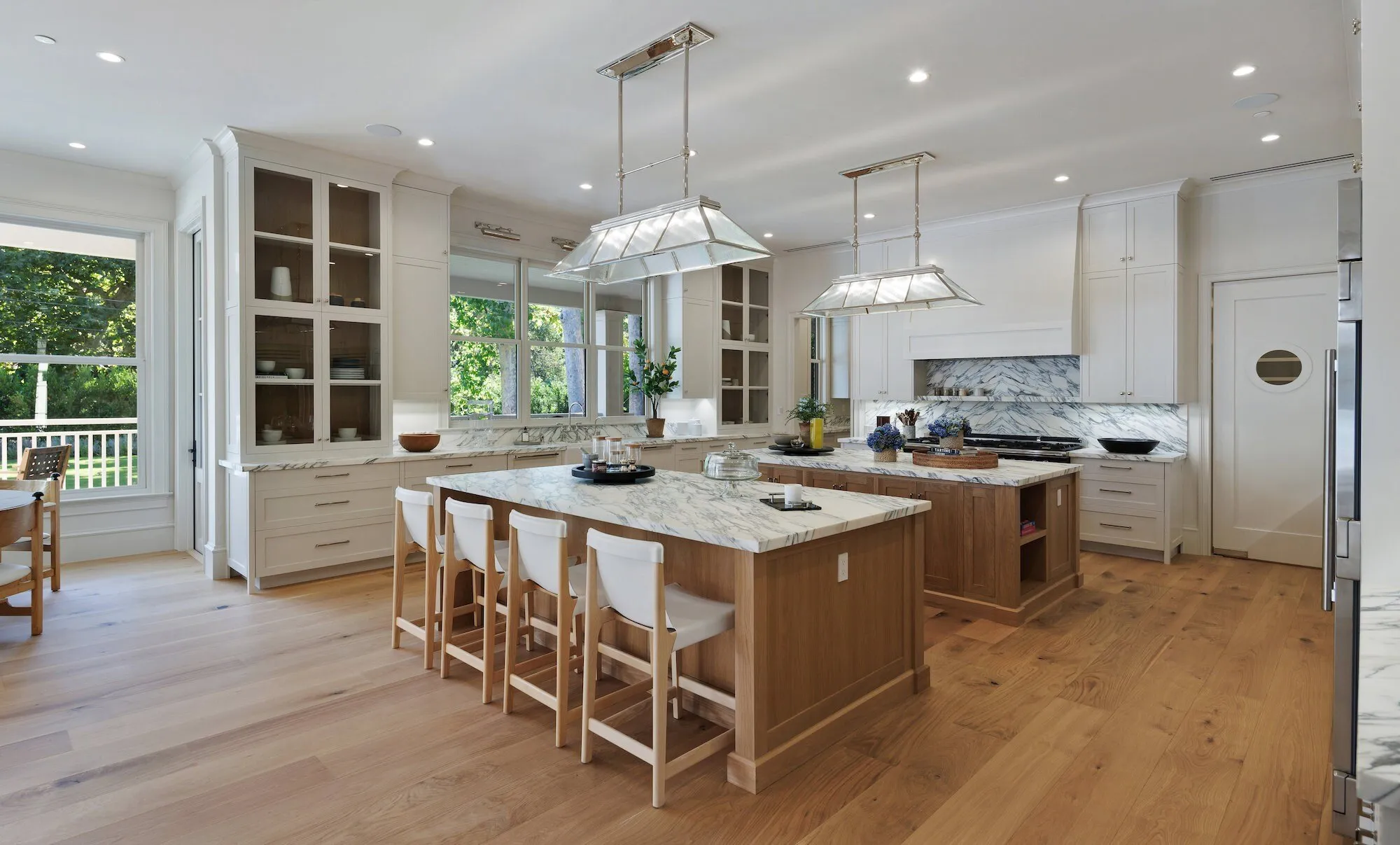 The kitchen is a gourmet chefs dream. A true state of the art kitchen, with white cabinetry, Double center island, marble coveted countertops and backsplashes, breakfast area and a service kitchen in the back and completing all the appliances.