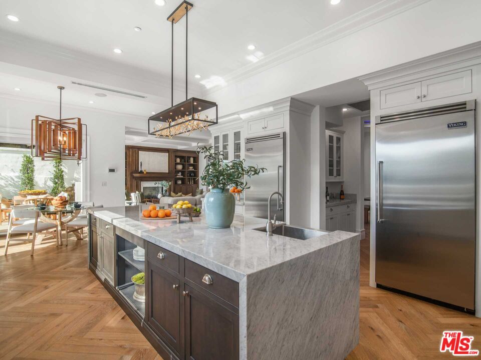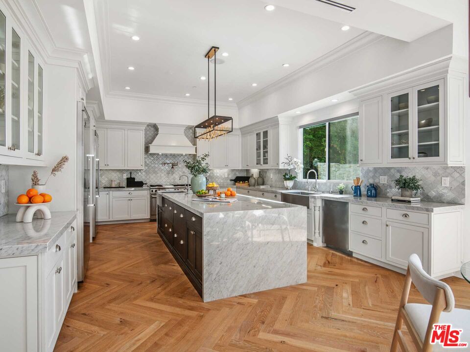 The kitchen is oversized and finished with white cabinetry with marble countertops, and tiled backsplashes. Also featuring stainless appliances, center island and a walk in pantry featuring a stunning wine cellar. An adjacent family room with large double doors makes an easy passage for outdoor dining. A large dining room and an en-suite, featuring a powder room and direct garage access, makes this floor complete.